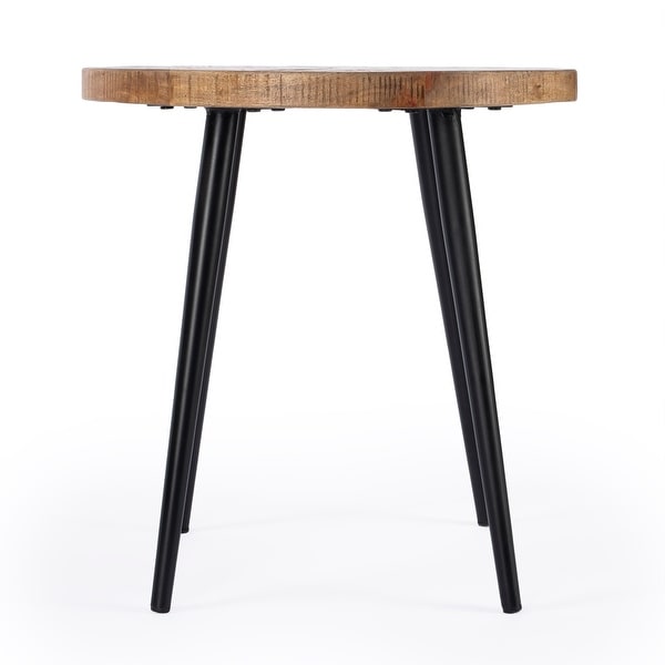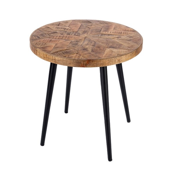 The glarious round side table brings texture and natural beauty to your living room, bedroom or den room space. The solid mango wood top has a gorgeous and intricate snowflake inlay design showcasing the gorgeous natural variations and texture of the mango wood. The tabletop sits on top of four black hairpin iron legs bridging modern and rustic looks seamlessly. Photo may slightly differ from actual item in terms of color/finish due to the lighting during photo shoot or the monitor's display.